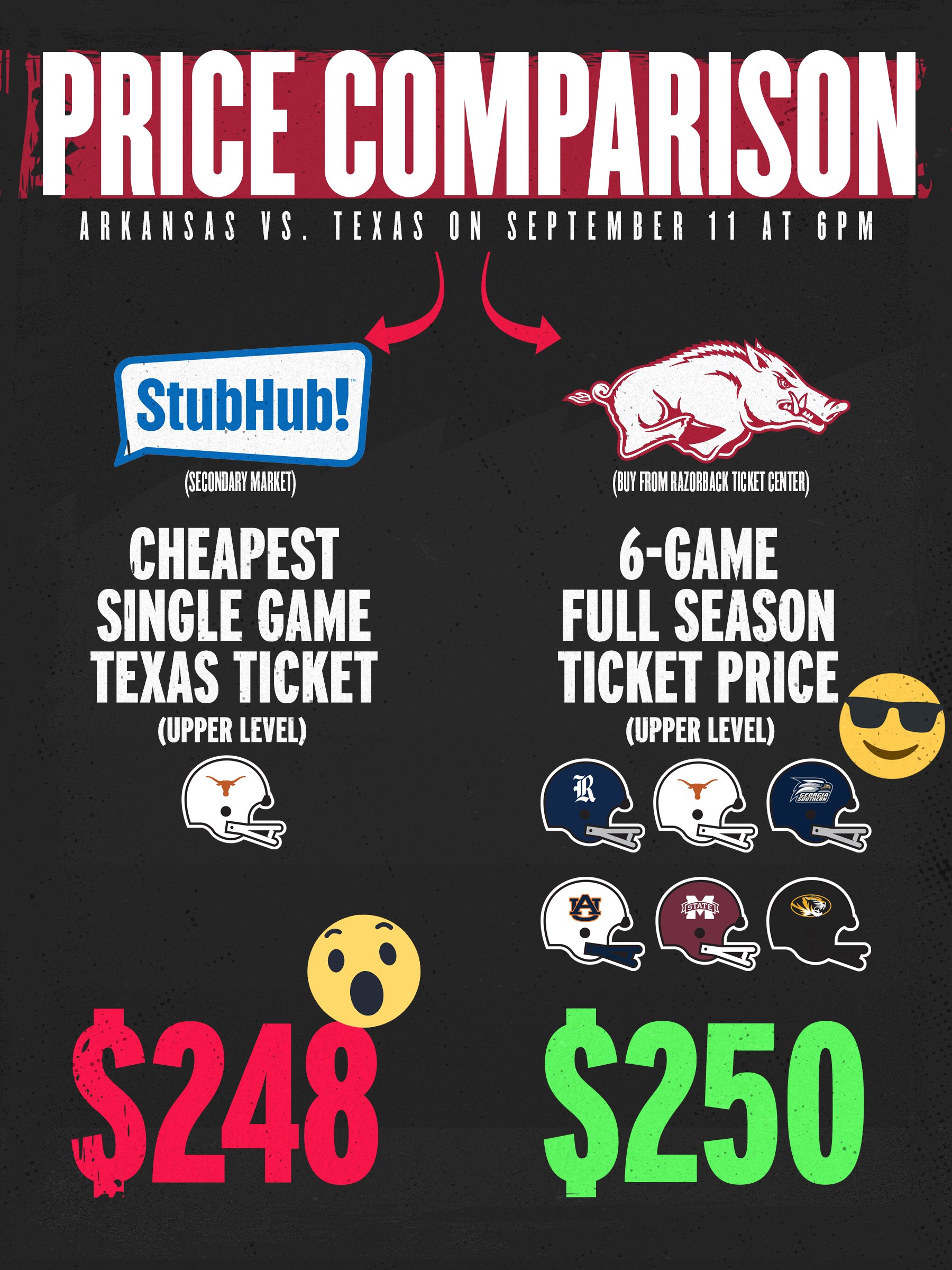 Arkansas Razorbacks On Twitter Texas Game Ticket Advice Share With Your Friends If You Want Lower Bowl Tickets Your Best Bet Is To Buy Season Tickets We Don T